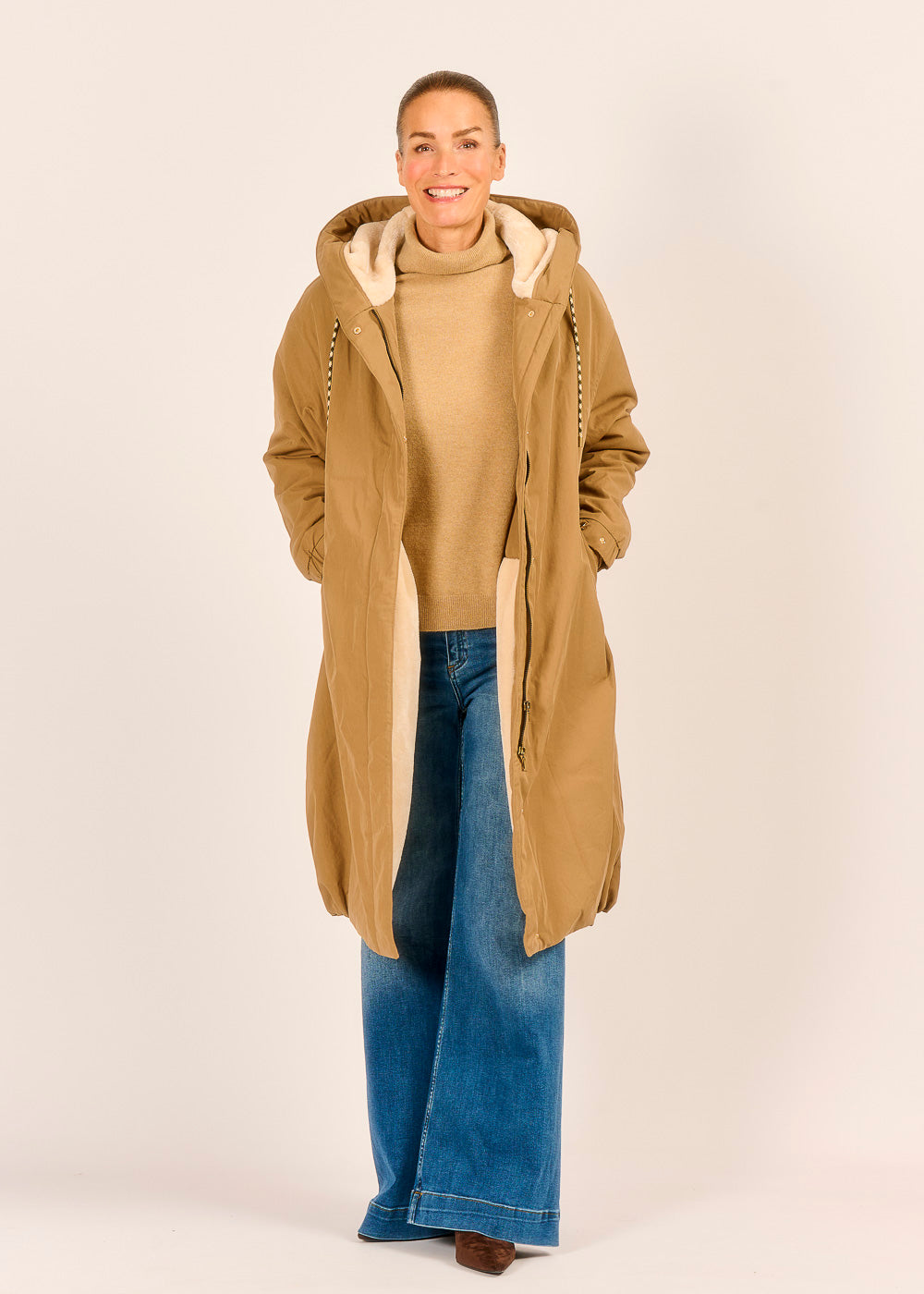 Dieser edle Rollkragenpullover in zeitlosem Beige ist ein Statement purer Eleganz, dessen feine Strickqualität sofort ein Gefühl von Luxus vermittelt. Sein klassischer Schnitt mit dem weichen Rollkragen sorgt nicht nur für wohlige Wärme, sondern rahmt auch Ihr Gesicht vorteilhaft und stilvoll ein. Kombiniert mit lässigen Jeans oder einem eleganten Rock, wird dieser Pullover schnell zum Key-Piece Ihrer Garderobe für jede Gelegenheit.