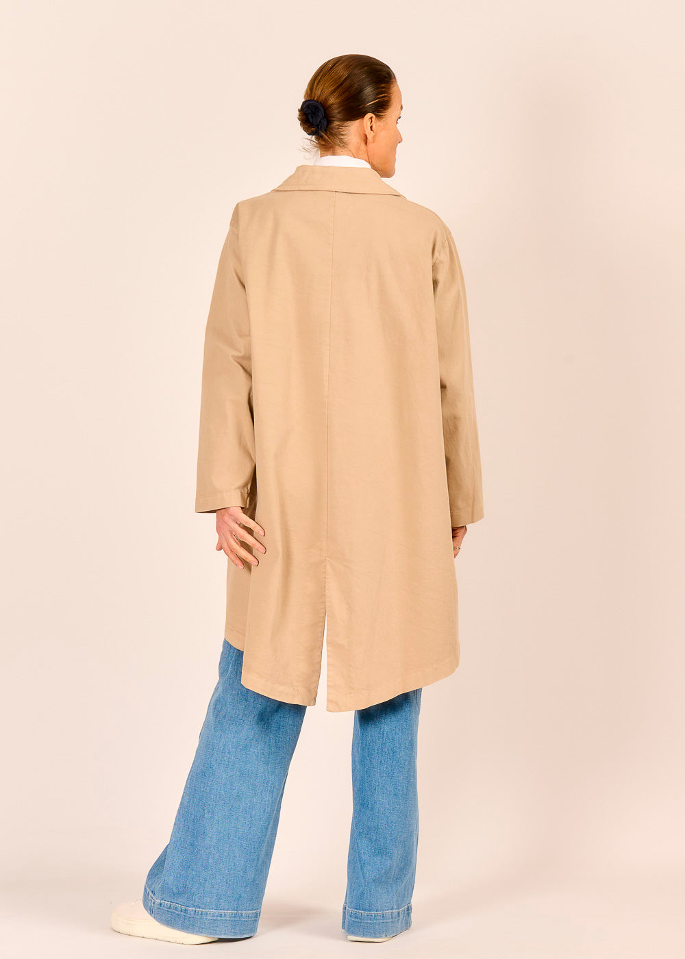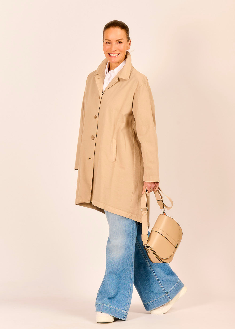 Der modisch geschnittene Mantel aus leichter Baumwolle bringt Mailänder Eleganz und das italienische Lebensgefühl in deinen Alltag. Warmes Beige lässt sich mühelos kombinieren. Vorne etwas kürzer geschnitten, hinten länger fallend, entsteht eine besondere Dynamik bei jedem Schritt. Dieser Mantel ist ein Statement für Stil mit Leichtigkeit.
