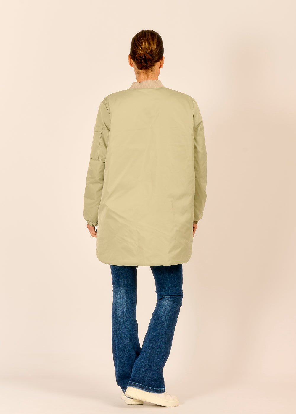 Der Wendebomberino sorgt durch den langen Schnitt für maximalen Komfort in der kühlen Übergangszeit. Dank seines cleveren Wendekonzepts lassen sich unterschiedliche Looks stylen. Die Farbe Pictacchio verleiht deinem Look Frische, die gesteppte Seite strahlt Ruhe und Gelassenheit aus.