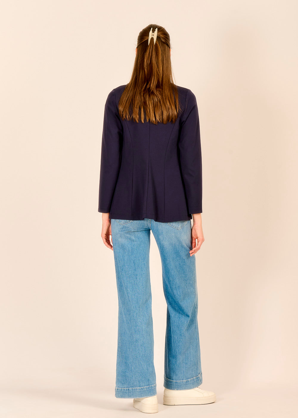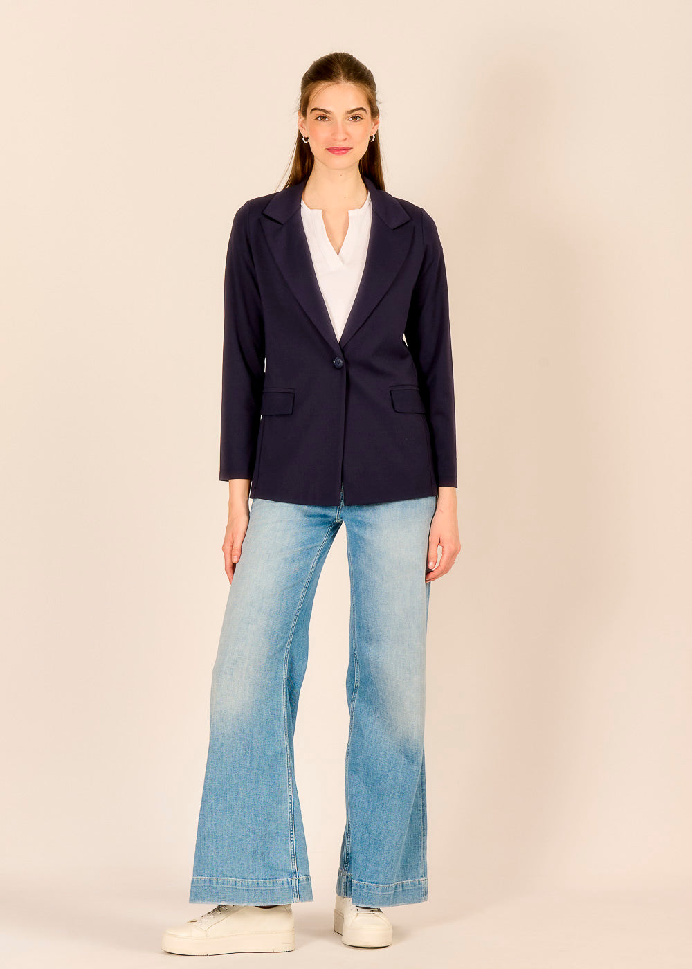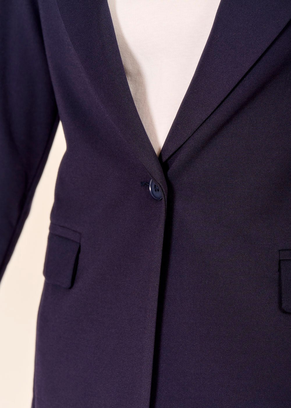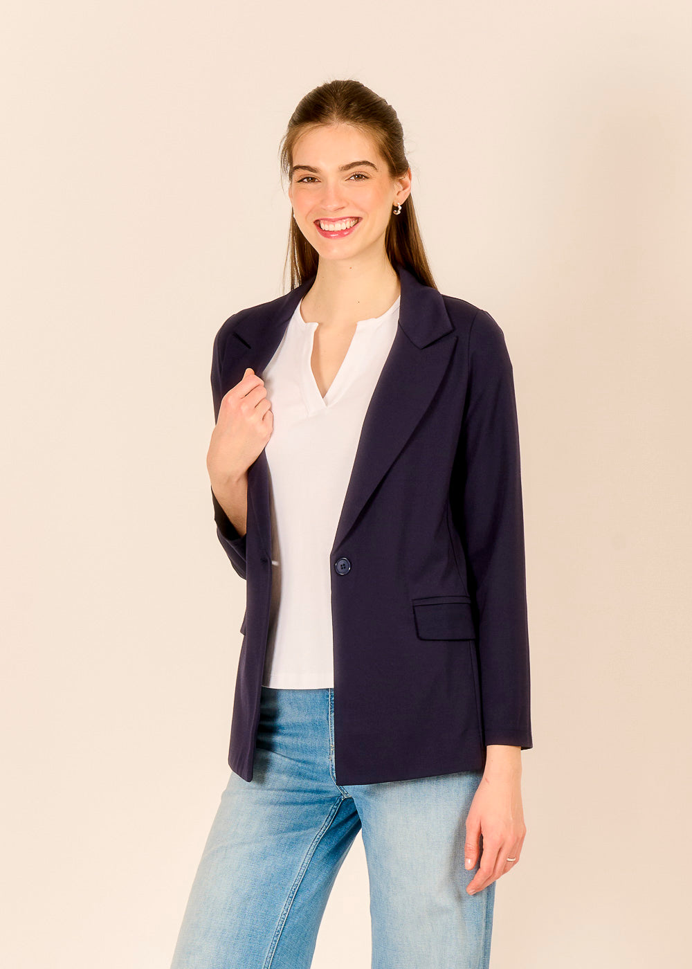 Der Punto di Roma Blazer mit seinem klassischem Knopfverschluss verleiht jedem Outfit eine souveräne Ausstrahlung. Der doppellagige Jerseystoff sorgt für ein weiches, fließendes Tragegefühl, das sich perfekt an deinen Körper anschmiegt. Dunkelblau wirkt edel und zeitlos – ideal für stilbewusste Business Styles und festliche Looks.